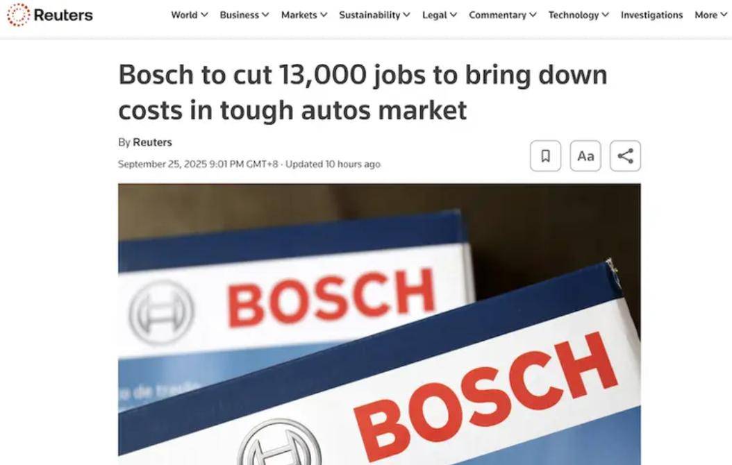 破产像股潮流,如多米诺骨牌一般席卷汽车制造业。2024年德国每6家破产的大型企业中就有一家是汽车零部件商。如雷贯耳的汽车厂商们也开始收缩、裁员,全球第一Tier1巨头博世近期被曝裁员1.3万人,加上此前的裁员规模已经超过2.5万人;采埃孚计划在德国削减1.1万至1.4万个岗位;大众也计划到2030年前让3.5万人下岗。