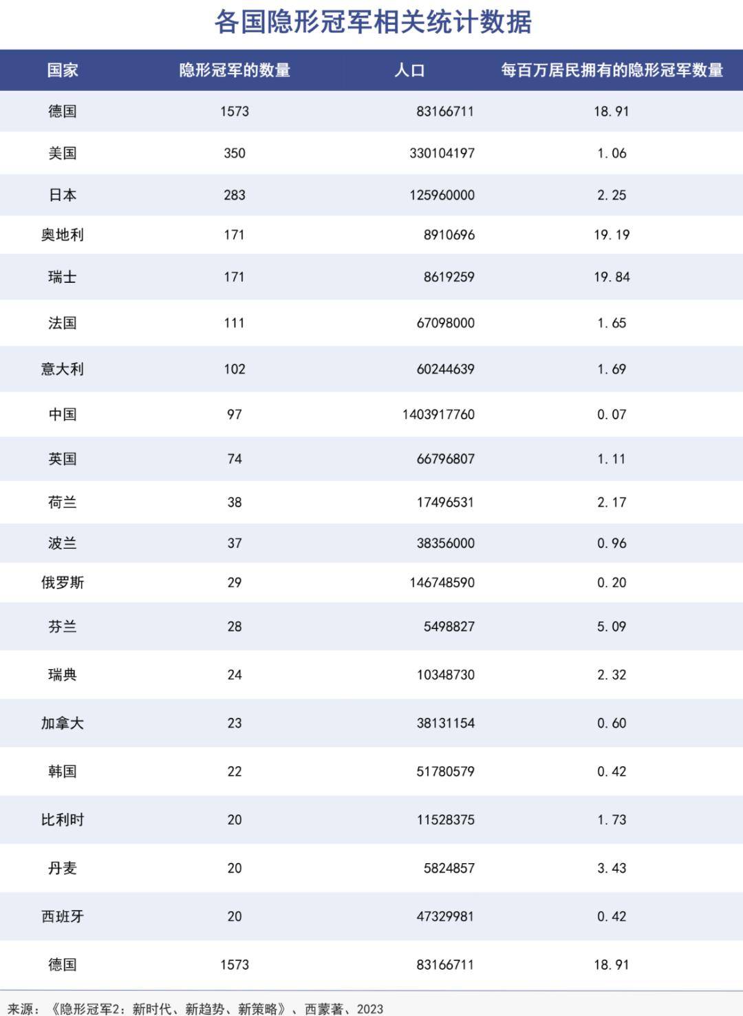 这些企业成就了欧美日经济在二战后的腾飞。根据西蒙的研究,他认为全球隐形冠军的数量为3406家(2023年),其中德国就高达1573家,接近全球的一半,紧接着是美国的350家和日本的283家,欧洲国家位列其后。