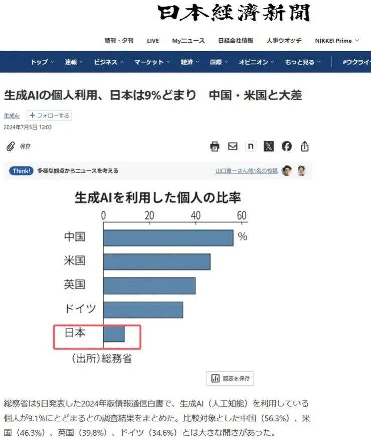 数字化基础薄弱,导致了这些企业不仅和互联网时代脱节,也和正在到来的AI应用时代脱节。根据日本经济新闻报道,日本正在使用AGI的人数,仅有9%,而中国这一数字已经接近60%,居世界第一,美国也超过50%。
