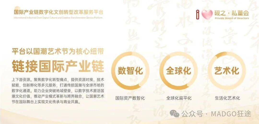以国潮艺术节为核心纽带,链接国际产业链上下游资源。聚焦数字化转型痛点,提供资源对接、技术赋能、创新孵化等多元服务,打通传统国潮与全球市场的数字化通道。